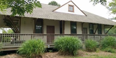 A reconstruction of the railroad station at Bloxom, including roof supports salvaged from the original building.