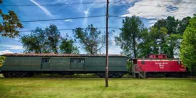 Our collection of railroad cars, including a caboose, baggage car, tank car, box car, flat car and gondola car.